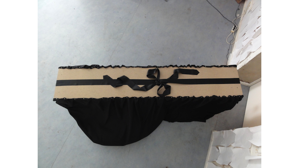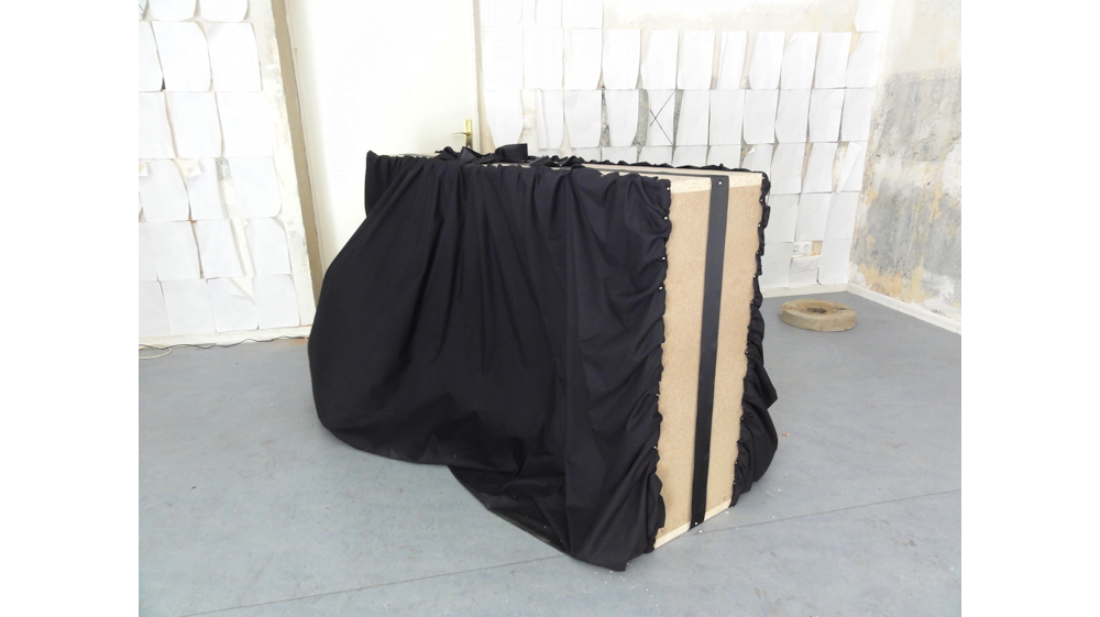 The space in between. The space between one room and another. The space between one thought and another. Sculpture with the dimensions of a door frame. Wooden frame 200cm x 90cm x 35cm, 3 electric fans, 800cm x 150cm black cloth, black satin ribbon, music. Presented in ‘Black Stars on a White Sky’, curated by Adam Nankervis at Another Vacant Space, Berlin, 2011