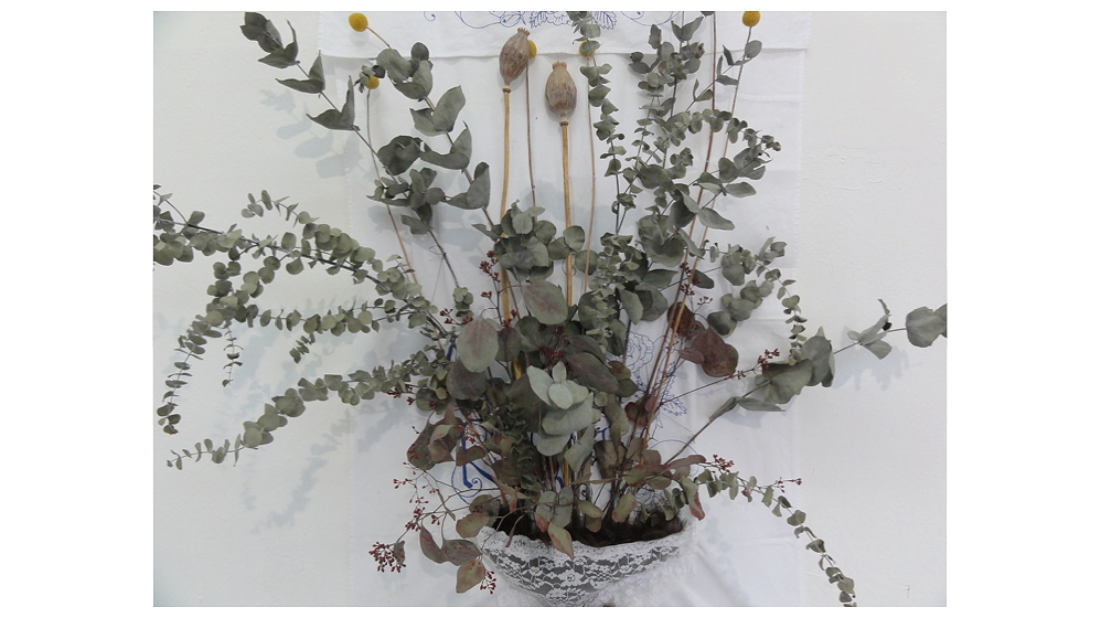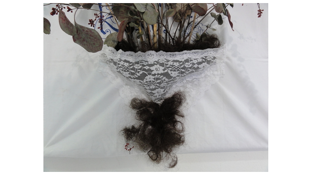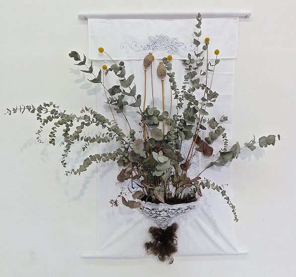 Used and natural materials: old kitchen curtain with embroidery, old underwear, human hair, dried plant matter. 100cm x 70cm