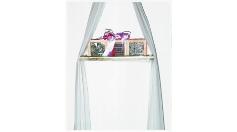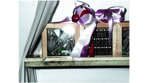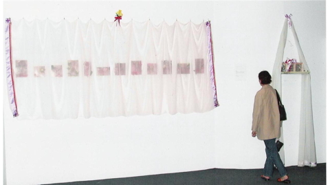 HOME SWEET HOME & THE CRADLE At the beginning of a relationship, I found suitcases full of pornographic magazines at my friends home. I decided to cut out certain scenes from the magazines. This collection of material I then used for my art work. HOME SWEET HOME is part of this collection. I undertook 3 cycles of In Vitro Fertilization treatment. All the medical waste from this treatment I kept, which then turned into THE CRADLE. HOME SWEET HOME - pornographic material, plastic flowers, sewing thread, coloured pencils. Varied sizes - all no larger than 20cm x 30cm. THE CRADLE - old window pane, white curtain material, 3 wooden vitrines, coloured satin ribbons, medical waste. Presented at ‘Changing Channels’, curated by Adam Nankervis, Backfabrik, Berlin. 2003