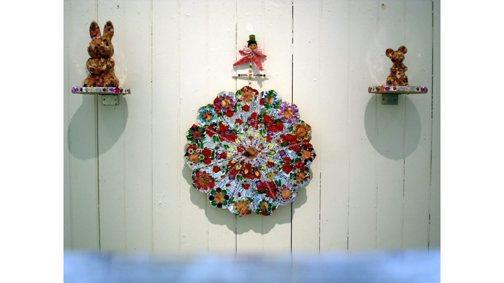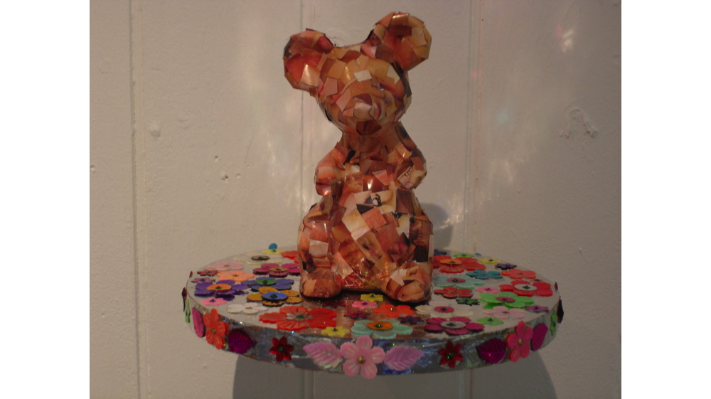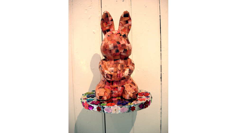 Installation - wood, pornographic magazines, sequins, polystyrene foam mouse & rabbit